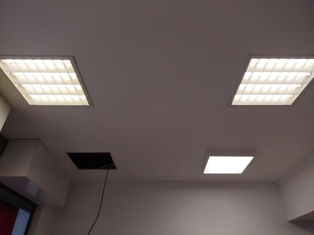 Les travaux ont débuté par le remplacement intégral des pavés lumineux existants par des pavés LED 60x60 Ledvance, installés en pose saillie afin de garantir une diffusion homogène de la lumière, une réduction significative de la consommation énergétique et une amélioration du confort visuel pour les occupants. Au total, 17 pavés LED ont été fournis et posés, incluant les supports en saillie, les câbles de raccordement et l’ensemble des petits matériels électriques nécessaires. L’ancienne installation a été évacuée en déchetterie, dans le respect des normes environnementales.